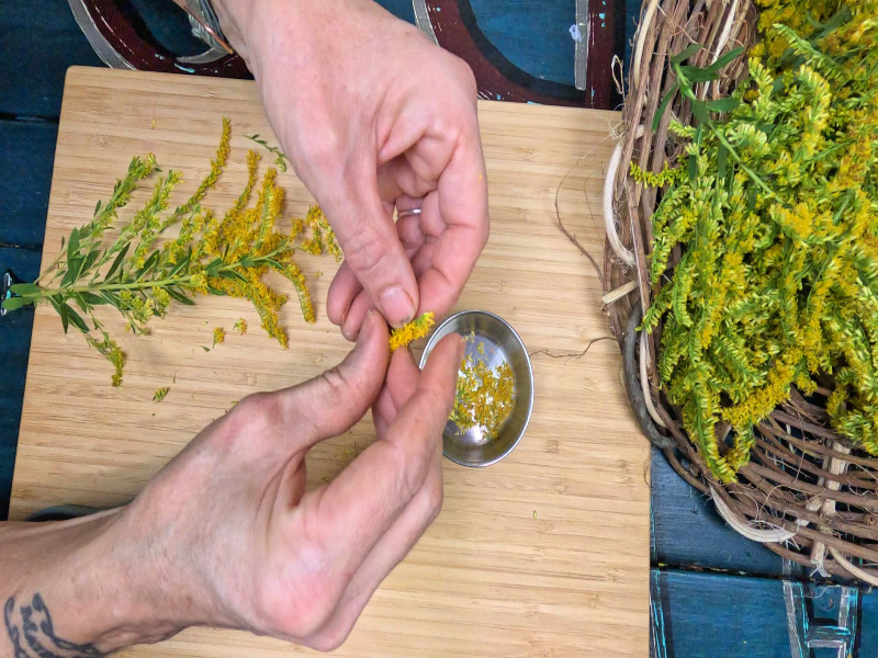 Goldenrod is best known for its medicine. Its genus name, Solidago, comes from the Latin solidus and ago meaning “to make whole.” Traditionally, it’s been used for colds, coughs, seasonal allergies, flu, and urinary tract support. I usually harvest when most of the blooms are open but some are still tight, then dry and store it for teas, tinctures, and salves.