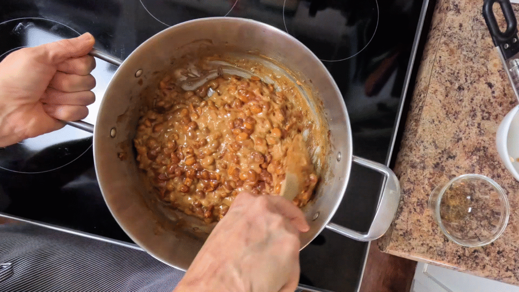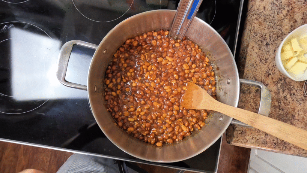 When it hits 300°F, you’ll see the syrup turn a deep amber and the peanuts roasting beautifully in the mix.