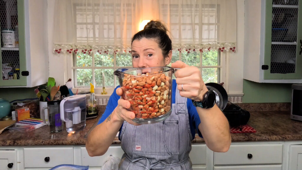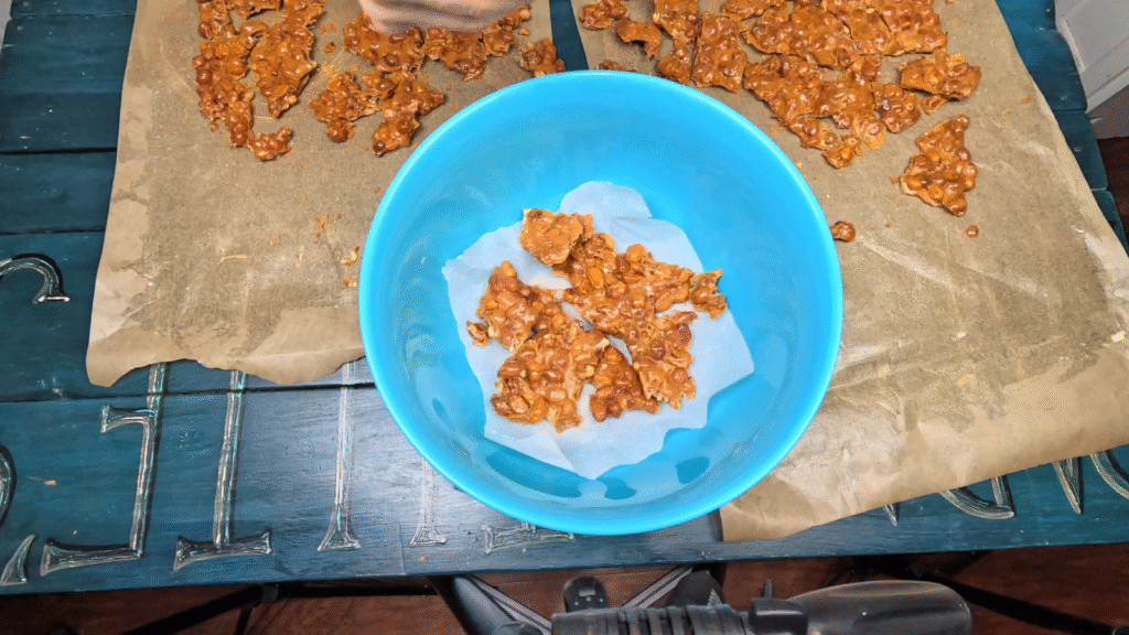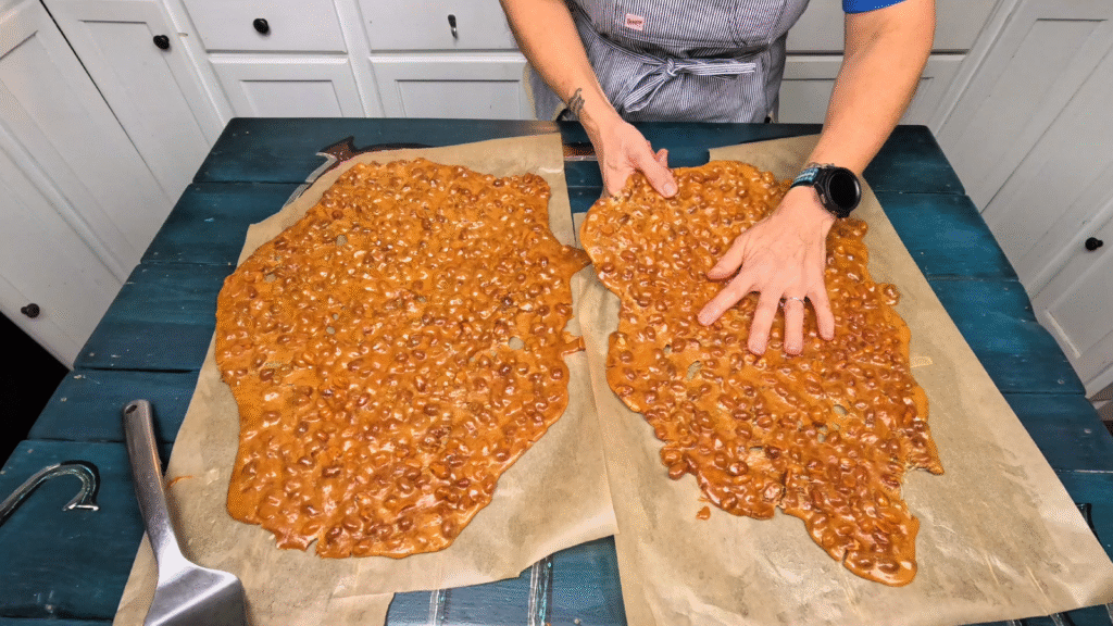 I use raw peanuts, which roast right in the syrup. It gives a deeper flavor, a darker color, and a toasty peanut aroma that fills the whole kitchen. Peanuts that are already roasted are sealed and do not add much to the candy base of the recipe. The result is light, crisp, and packed full of flavor. Every bite’s got peanuts in it, just the way God intended.