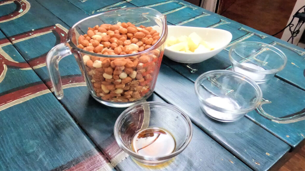 • Measure out your peanuts, salt, vanilla, butter, and baking soda.