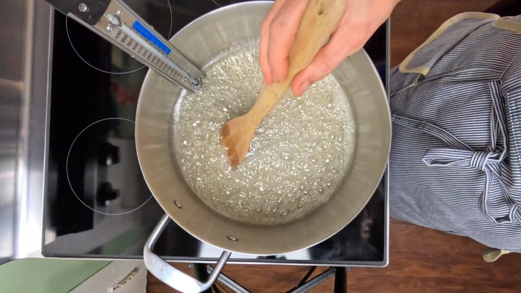 Then keep it steady on medium (or a notch below) until it reaches 250–260°F. The syrup should bubble smooth and clear.
