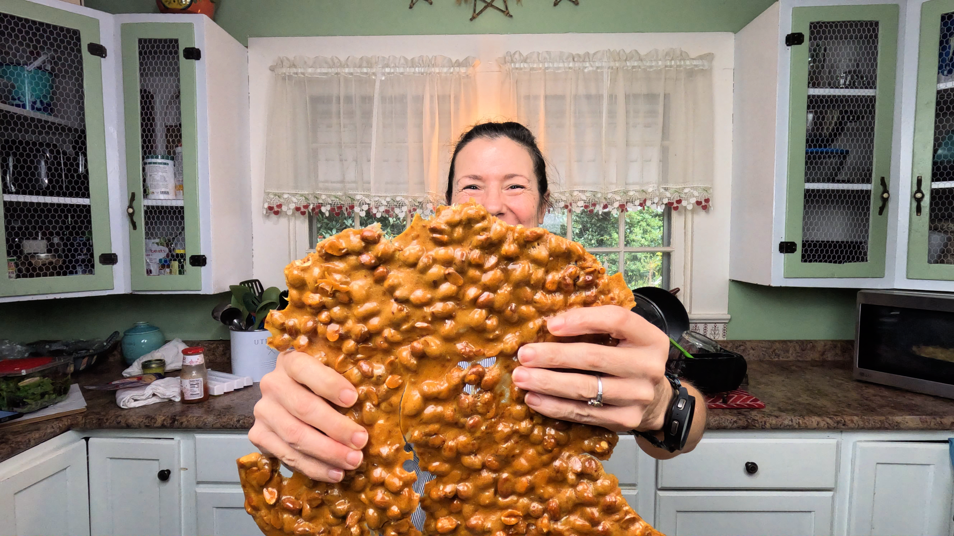 I use raw peanuts, which roast right in the syrup. It gives a deeper flavor, a darker color, and a toasty peanut aroma that fills the whole kitchen. Peanuts that are already roasted are sealed and do not add much to the candy base of the recipe. The result is light, crisp, and packed full of flavor. Every bite’s got peanuts in it, just the way God intended.
